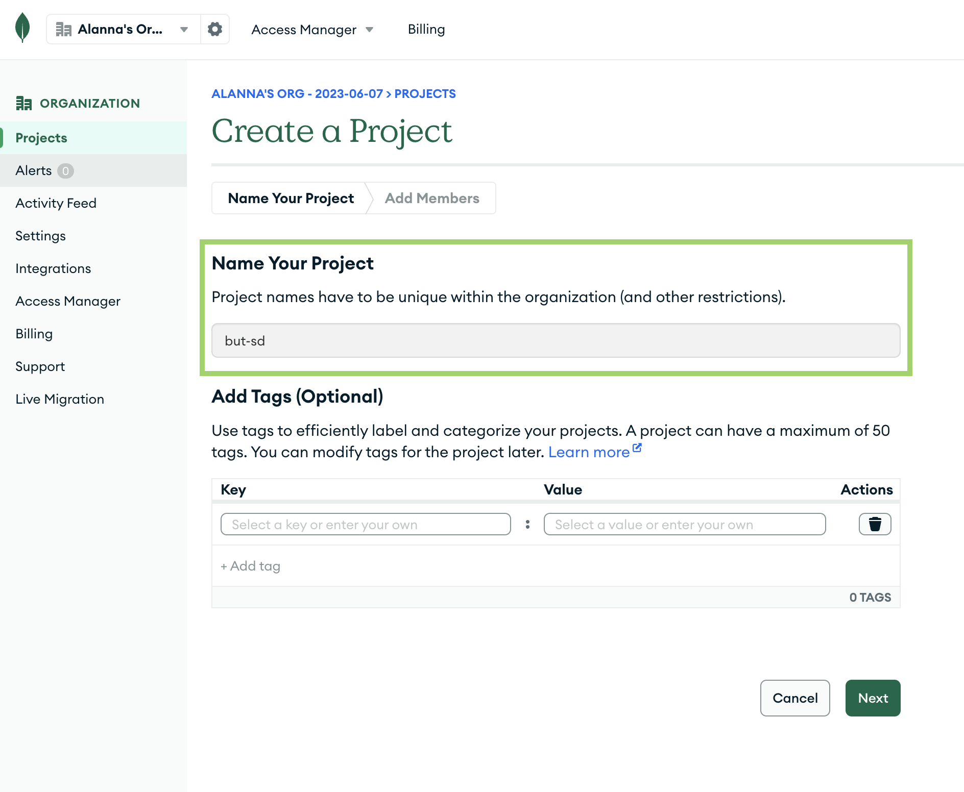 Une fois que vous avez créé votre compte vous allez pouvoir créer un projet, nommé but-sd ici. Ensuite, une page demandera d’ajouter des membres, il n’y a rien à faire. Confirmez simplement la création du projet en cliquant sur Create project.